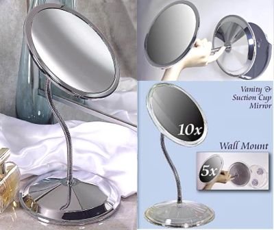 Prepare yourself for the ultimate in bathroom mirrors; prepare for the Double Vision Vanity & Suction Cup Mirror... its TWO mirrors in ONE! Yes, two powerful 6 1/4" mirrors, with 5 X & 10 X magnification (respectively) make up this mirrored marvel, anchored by a 11 1/4" flexible Goose Neck that will extend and adjust to any angle you need. The exclusive vanity or wall mount design is a real treat, with patented Slide-On Suction Cup Mounting Bracket in Chrome Finish to seal the deal. .