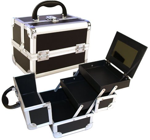 Black makeup case with mirror or without mirror has high quality aluminum frame with reinforced steel corners. Easy to clean interior with swivel handle top.