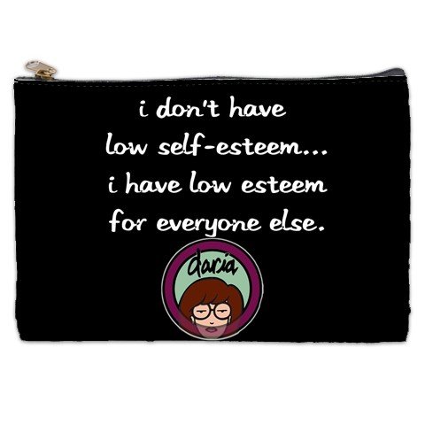 Buy Cosmetic Bag (Makeup Bag) Large (2-Sided) of Daria Low Self-Esteem Phrase. This is a great gift idea for the ladies in your life. These cosmetic bags are designed to fit essential make up gear, giving it maximum points for practicality when carrying around your lip gloss, bronzer, nail polish, etc. Made from durable 600d polyester fabric. Zippered closure for easy access . Zippered hidden interior compartment. Double sided printing. Approx. Dimensions: 9" width x 6" height.